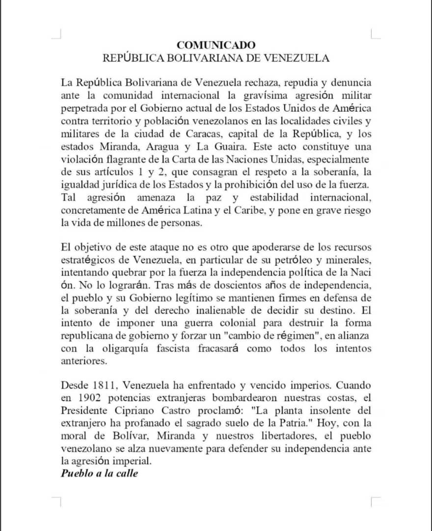 El Gobierno de la República Bolivariana de Venezuela emitió un comunicado oficial en el que rechaza, repudia y denuncia ante la comunidad internacional una presunta agresión militar atribuida a Estados Unidos contra territorio y población venezolana. Según el texto, los ataques habrían impactado zonas civiles y militares de Caracas y de los estados Miranda, Aragua y La Guaira, en un contexto de máxima tensión regional.