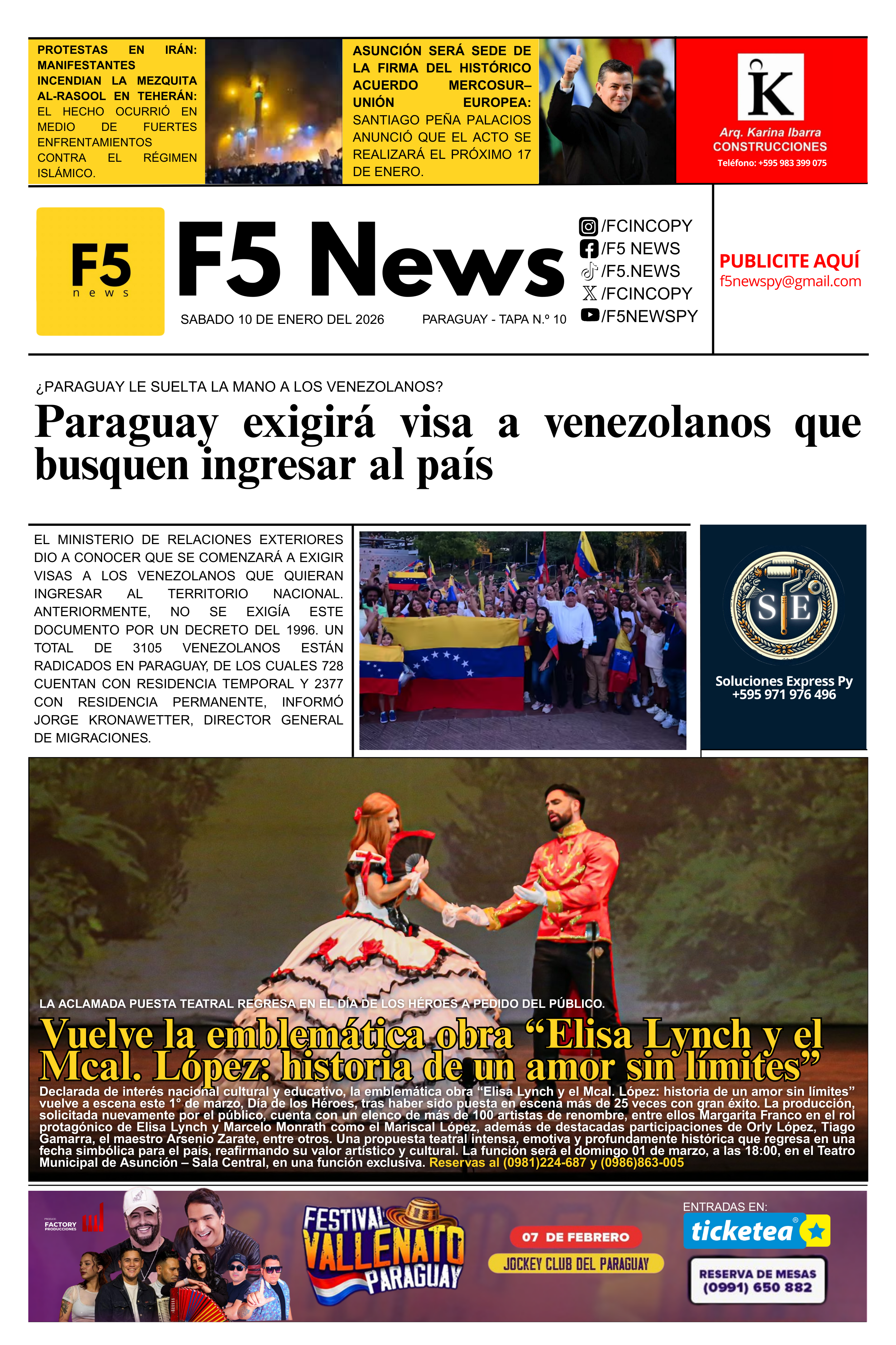Como contenido destacado complementario, el ámbito cultural celebra el regreso de la emblemática obra “Elisa Lynch y el Mcal. López: historia de un amor sin límites”. La aclamada puesta teatral volverá a escena a pedido del público en una fecha simbólica para el país, reafirmando su valor artístico, cultural e histórico. El espectáculo, que reúne a un amplio elenco de artistas nacionales, se presentará en una función especial en el Teatro Municipal de Asunción – Sala Central, consolidándose como una de las propuestas teatrales más significativas del calendario cultural. RESERVAS AL (0981)224-687 O AL (0986)863-005