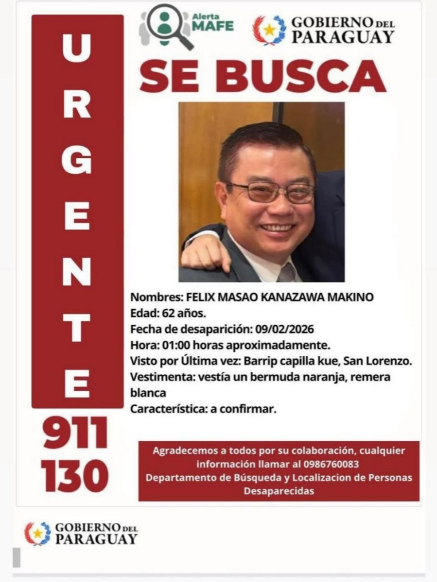 La Policía Nacional del Paraguay activó un pedido público de colaboración para dar con el paradero de Félix Masao Kanazawa Makino, ex presidente de la Dirección Nacional de Aeronáutica Civil (Dinac), quien permanece desaparecido desde la madrugada del sábado 7 de febrero.